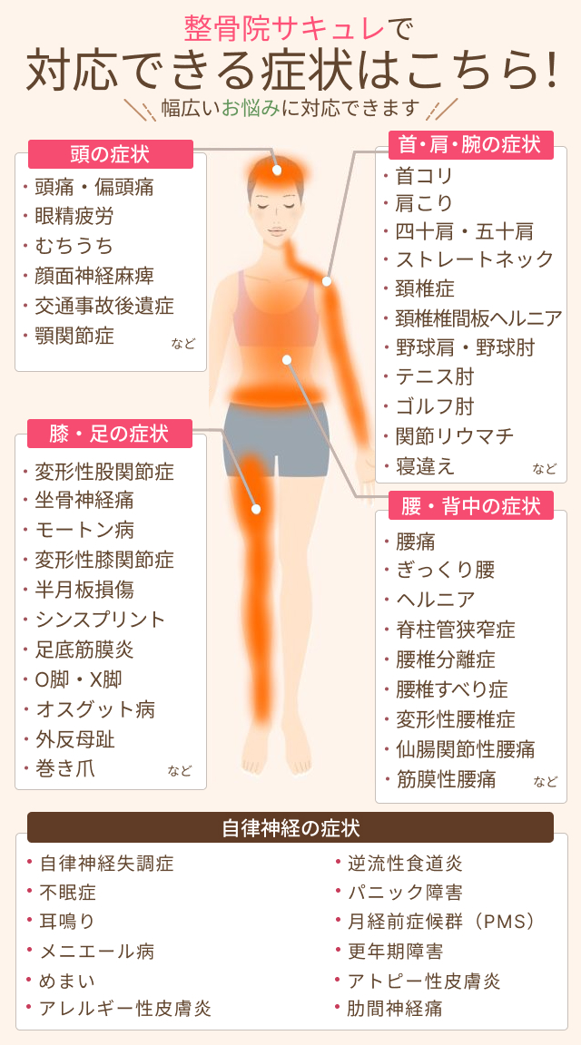 当院は病院や整骨院、他の整体院に行かれた症状に変化がない方が多数来院されています。なぜ、他で良くならず整骨院サキュレで改善されるのか?