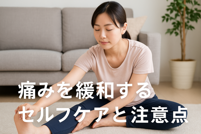 ・床に座って片脚を伸ばし、つま先を自分の方に引き寄せて、ふくらはぎを伸ばすストレッチも有効。