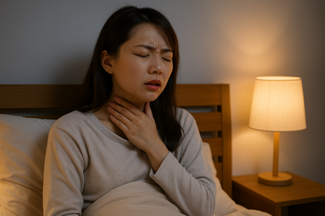 「夜中だけ痛む」「朝方が特につらい」場合、実は胃酸が関係していることもあります。食後すぐに横になると、胃の内容物が逆流しやすくなり、強い酸性の胃液が喉の粘膜を刺激してしまうのです。食事は就寝の2〜3時間前までに済ませたり、枕を少し高くするだけでも、刺激を軽減できることがあります。