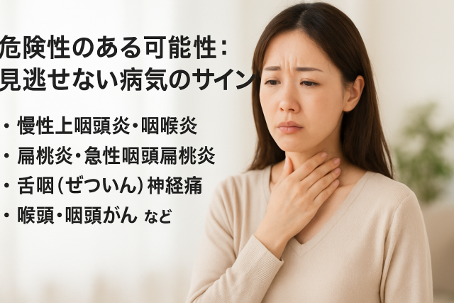 喉の痛みが「乾燥かな」と思っていたら、実は放っておくと危険なケースもあります。軽い違和感に見えても、特定の病気が隠れている場合があるので、注意して見極めることが大切です。