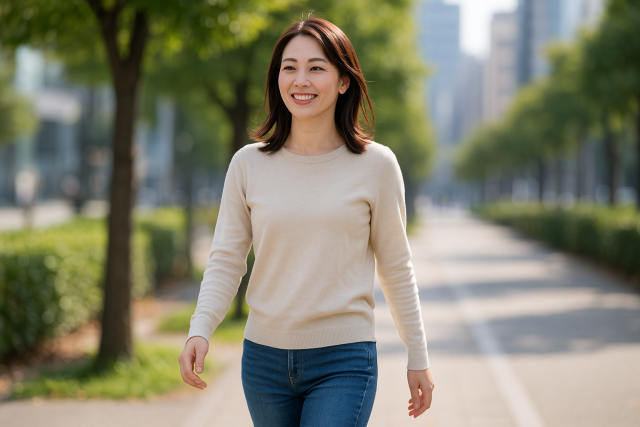 座るときは背もたれに深く腰をかけ、骨盤を立てて背すじを軽く伸ばすのがポイント。立っているときは、片足に重心をかけすぎず、耳・肩・くるぶしが一直線になるよう意識してみましょう。歩くときも、背中を丸めず軽く胸を張るだけで、腰や脚の負担が減っていきます。