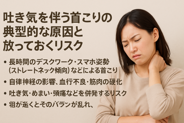 「ただの首こりで、吐き気まで?」と思う方もいるかもしれません。けれど、そこにはしっかりした理由があります。