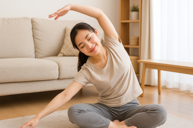「最近、肩や腰がしんどいな…」と感じたら、まずはゆっくり体をほぐす時間を持ちましょう。ストレッチは、筋肉だけでなくその周りを包む膜=筋膜の滑りを良くすることにもつながります。例えば、肩甲骨回りを大きく動かしたり、床や椅子を使って体を揺らしたりするだけで、筋膜の癒着を軽くできるという報告があります。