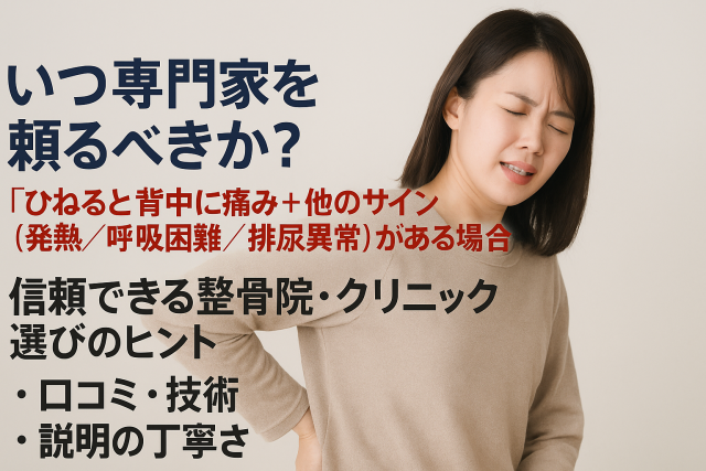・「ひねると背中に痛み+他のサイン(発熱/呼吸困難/排尿異常)」がある場合