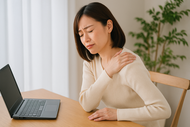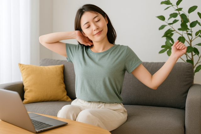 長時間同じ姿勢でいると、血流が滞りやすくなり、筋肉がこわばります。仕事中は1時間に1回、背伸びや肩回しをするだけでも違いますよ。