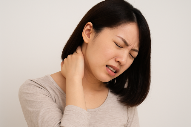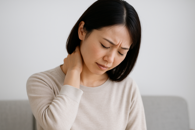 多くの場合、首の後ろや肩のつけ根あたりに鋭い痛みや重だるさが出ます。中には「突っ張る感じ」や「後頭部の重さ」を伴う人も。