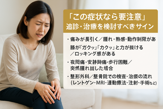 ・腫れ・熱感・膝のぐらつきなど併発症状のチェック