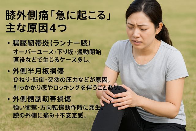 ・外側側副靱帯損傷 — 強い衝撃・方向転換動作時に発生。膝の外側に痛み+不安定感。