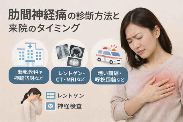 肋間神経痛では、来院先に迷う方が少なくありません。例えば、姿勢や体の動きで痛みが変わる場合は整形外科、内臓の不調が疑われる場合は内科が選ばれることがあります。帯状疱疹が関係していそうなときは皮膚科、しびれや感覚異常が強い場合は神経内科が検討されることもあります。症状の出方によって窓口が分かれるのが特徴です。