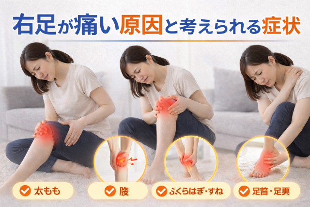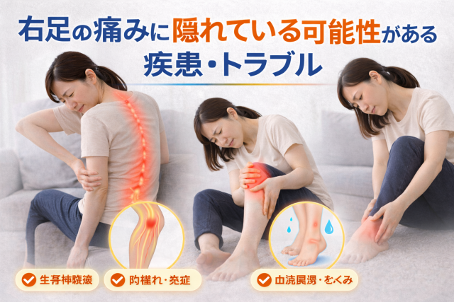 例えば、右足の痛みに加えてしびれやだるさが広がる場合、単なる疲労とは違う可能性も考えられます。体全体の変化にも目を向けることが大切です。