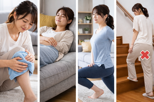 また、しゃがむ・階段・長時間の歩行など、痛みが出る動作は一時的に控えましょう。ここで無理をすると、長引く原因にもなります。