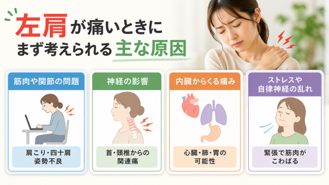 左肩が痛いと感じたとき、多くの方が「肩こりかな」と考えるかもしれません。ただ実際には、原因は一つではなく、いくつかのパターンが重なっていることも少なくありません。