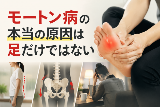 たとえば骨盤が前に倒れ、重心がつま先側に乗りやすい姿勢になると、前足部へ負担が集中します。すると足指の間の神経に繰り返しストレスがかかります。