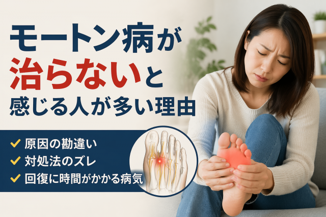 モートン病は、足指の付け根付近で神経が刺激され、しびれや痛みが出る状態です。炎症が落ち着くと少し楽になることがありますが、足に負担がかかる原因が残ったままだと再発しやすくなります。